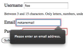 Now that you know how all the parts work, let’s put them together into a real-world example. Let’s say you have a simple signup form, consisting of fields for a username, password, and email address. Here’s the markup: