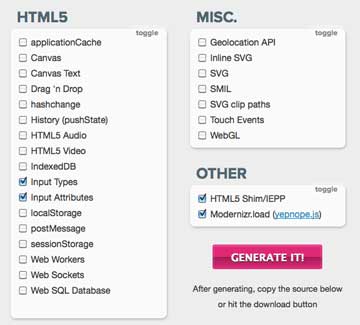 The new custom Modernizr builder allows you to bundle yepnope right into Modernizr, so let’s do that. Head over to http://modernizr.github.com/Modernizr/2.0-beta/. In this case all we need to detect are the form attributes and input types, so click those two checkboxes, leaving the HTML5 Shim and Modernizr.load (yepnope.js) boxes ticked.