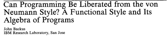 Another good paper is: Can Programming Be Liberated from the von Neumann Style? by John Backus. This is one of the very early papers on what he called “ML,” which is a functional programming language. ML is the foundation for things like Haskell and OCaml.