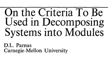 The first one is: On the criteria to be used in decomposing systems into modules by David Parnas. He took a very simple program called “keyword in context” where you go through a text file, find all the words, find out where they are used and record the context of where they are used so you can display them in an index, with the words surrounding them. This was actually an experiment. He wrote the system in two different manners, and compared what happened to them when he introduced changes to the requirements. What he found was that the best way to break down the program into modules is to have each module hide a secret.