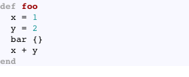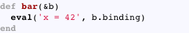 Yes, because the bar method is evaluating in the binding of the proc, it is going to change the values of the local variables. So in RubyMotion if you try to use Proc#binding it will raise an exception and say we don’t support that.
