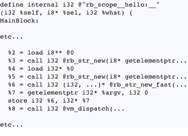 Q: I read on your web site somewhere that you’re using LLVM as the technology behind your compiler. I’m wondering how that works, at a high level. Do you compile the Ruby code into the LLVM IR instruction set?