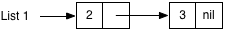 Now I have two linked lists, which share the same cons cells for 2 and 3. As long as you never actually change one of the elements in place, it’s no problem at all for the elements of different linked lists to be shared!