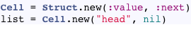 One simple way to create linked list would be to use the Struct object to represent a cons cell, like this: