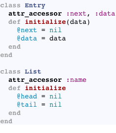 Another approach would be to create separate Entry and List objects, as described by Eno Compton his excellent article: Reversing a Linked List in Ruby. Here’s the code: