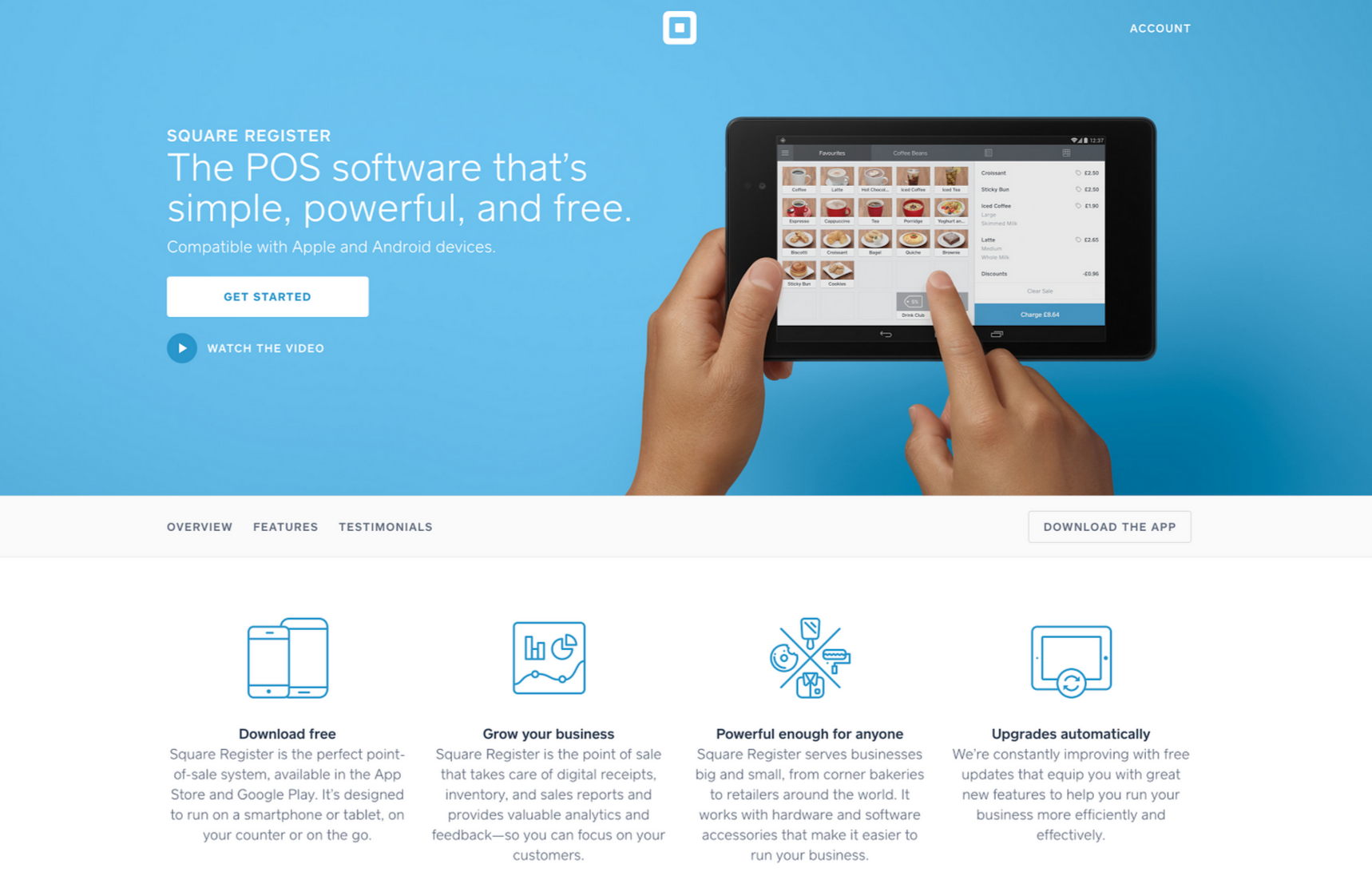 A Mac on a desk doesn’t tell me much about your product. Show me your product! Square has a great example of this: