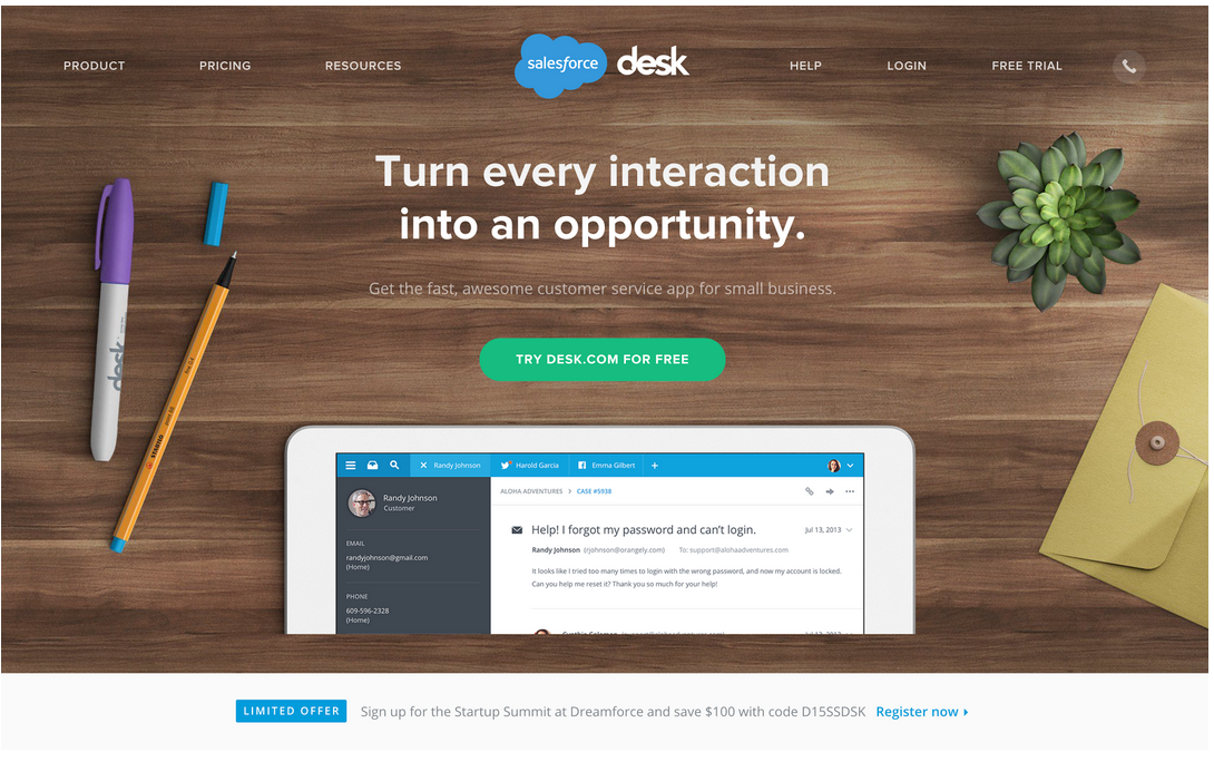Desk is another example of using a contrasting color for your main CTA. You’re left in no doubt as to where they want you to click. Note the text on the button says exactly what will happen when you click, rather than using the more generic “Get Started” or “Sign up now”.